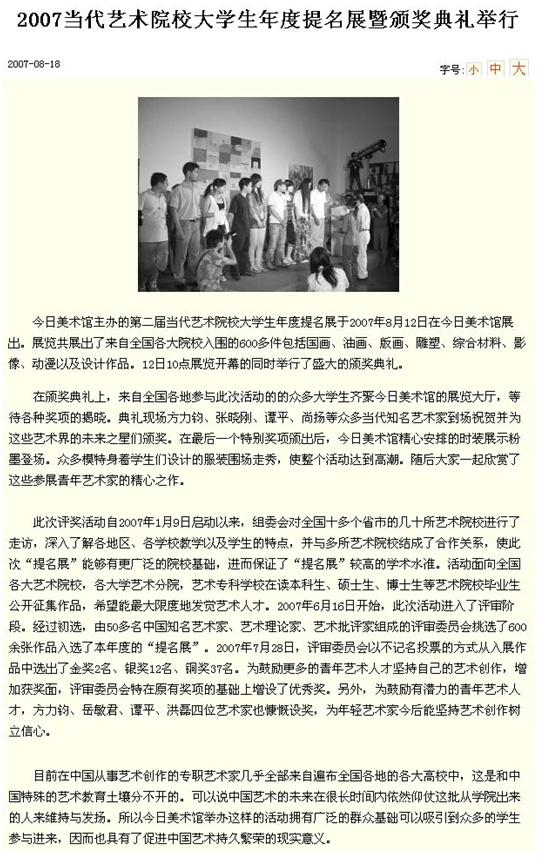 由今日美术馆主办的第二届当代艺术院校大学生年度提名展于2007年8月12日-29日在今日美术馆展出,颁奖典礼暨展览开幕式在8月12上午10点举行。此次展览展示了入围作品600多件,包括国画、油画、版画、雕塑、综合材料、影像、动漫以及设计作品。在展览开幕式上,北京市的相关领导、众多知名艺术家、艺术理论家、艺术评论家、知名艺术教育家莅临典礼现场,亲自为获奖艺术家颁奖。今日美术馆希望通过此次提名展能展现中国当代新生艺术力量的实力,让世界了解中国的年轻艺术家,让中国年轻艺术家得到更广泛的关注。 |